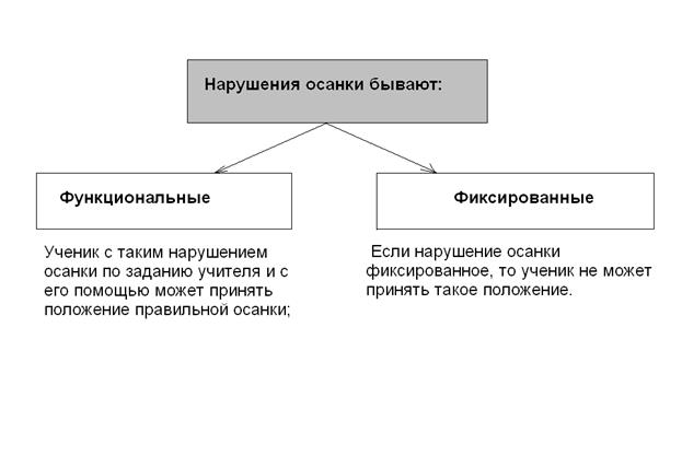 Если у школьника фиксированное нарушение осанки, то занятия с ним проводятся в специальных группах под руководством врача. На уроках учитель работает с учениками, имеющими нормальную осанку или с функциональными её нарушениями. Функциональные нарушения часто появляются вследствие неправильного обращения родителей с детьми в раннем возрасте. Носят на одной и той же руке, водят за одну и ту же руку, если он пользуется не соответствующей его росту мебелью, носит обувь не по ноге и так деле. Всё это приучает маленького человека к ассиметричным положениям тела, в результате чего мышцы одной половины тела преимущественно растянуты, а другой - сокращены. Такое положение тела становится для ребёнка привычным и удобным. В дальнейшем он уже и при отсутствии стимуляторов будет стараться принять его.