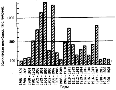 На фоне общей тенденции к повышению численности людей имели место отдельные снижения этого показателя (рис. 12.2). Причиной снижения, отраженного на диаграмме динамики населения планеты, явилась эпидемия чумы с большой смертностью, которая в средние века распространилась на значительные территории. Предполагают, что сокращение численности людей на территории Европы происходило также в начале каменного века. Причина состояла в уничтожении племенами, освоившими технику коллективной охоты, основного источника пищи — крупных травоядных животных. Заметные колебания численности на ограниченных территориях происходили вследствие, например, особо опасных инфекций. Они были закономерными явлениями в жизни целых народов еще в начале текущего столетия (рис. 12.3).