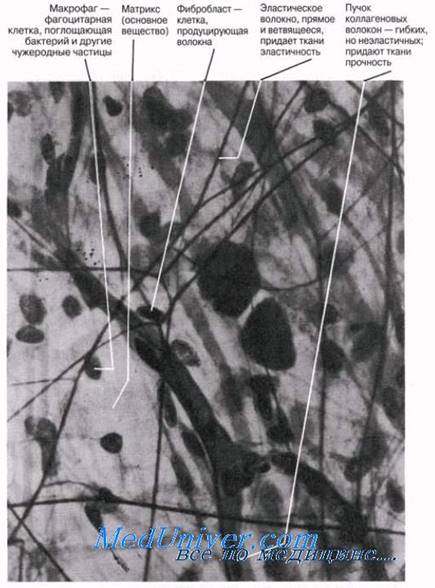 Волокнистая соединительная ткань представляет собой волокна (колла-ген) и межклеточное вещество (протеогликаны и гликопротеиды), окружающие соединительнотканные клетки (фибробласты, макрофаги, тучные клетки) и яв-ляющиеся продуктом этих клеток. Эта ткань образует строму многих внутрен-них органов, основу слизистых оболочек, соединяет кожу с мышцами, участвует в формировании надкостницы.