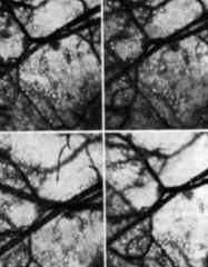 Фотографии изображений, восстановленных с одного кадра микрокиноголограммы. Показана различная глубина фокуса, что можно видеть по появлению и исчезновению капилляров из фокуса. Можно видеть пузырьки, проходящие по центральной артерии (С разрешения М. Е. Кокса, Университет Мичиган-Флинт).