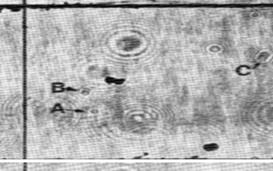 Рис. 1.5. Голограмма Фраунгофера (а) волокнистых частиц и изображения отдельных частиц (б, в, г), восстановленные с участков голограммы А, В, и С соответственно (С согласия Ботнера и Томпсона [1.8]).