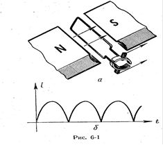 Принцип работы генератора постоянного тока основан на возникновении ЭДС в рамке, вращающейся в магнитном поле (Рис.6-1, а). За один оборот в каждой рабочей (активной) части рамки ЭДС дважды меняет знак. Чтобы ток во внешней цепи имел только одно направление (постоянное), применяют коллектор - два полукольца, соединенные с концами рамки, а рамку соединяют с внешней цепью через вращающийся коллектор и неподвижные щетки. Как только активная сторона рамки начнет пересекать линии магнитной индукции в противоположном направлении по сравнению предыдущим, соединенное с этой стороной полукольцо коллектора начнет соприкасаться с другой щеткой. Благодаря такому устройству направление тока во внешней цепи остается неизменным, хотя его значение изменяется (пульсирует, Рис.6-1, б).