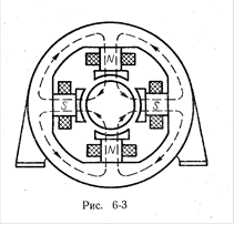 Машины постоянного тока часто делают многополюсными (Рис.6-3), при этом в каждой секции обмотки за один оборот значение и знак ЭДС изменяются столько раз, сколько полюсов. Магнитная цепь такой машины более сложная, при этом число пар щеток равно числу пар полюсов, а щетки одинаковой полярности соединяют вместе.