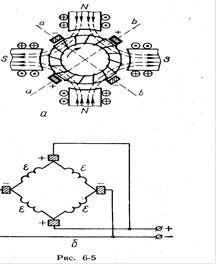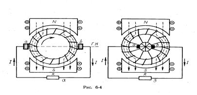Если якорь изготовить в виде кольца и на нем разместить обмотку в виде замкнутого тороида, то такой якорь называют кольцевым, а обмотку - спиральной. При вращении этого якоря в магнитном поле в витках его обмотки будут индуцироваться ЭДС (Рис.6-4, а). Оказывается, что в витках одной половины обмотки ЭДС имеет один знак, в витках другой половины - противоположный.