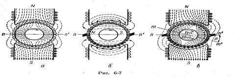 Рис.6-9полюсов одновременно ослабляет и влияние реакции якоря. У генераторов за главным полюсом по направлению его вращения ставят дополнительный полюс противоположной полярности, а у двигателя - такой же полярности. Это условие автоматически выполняется при переходе машины из режима работы генератора в режим двигателя, так как направление тока изменяется на противоположное.