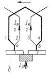 Перед началом коммутации, когда щетка соприкасается только с коллекторной пластиной 1 (Рис.6-8, а), ток нагрузки I, протекает от пластины 1 до точки а, где разветвляется в обе параллельные ветви. Интересующая нас секция (на чертеже выделена жирной линией) находится в правой параллельной ветви. Как только правый край щетки коснется пластины 2, начнется процесс коммутации, который будет продолжаться, пока левый край щетки не сойдет с пластины 1, при этом в течение всего периода коммутации выделенная нами секция будет замкнута накоротко щеткой (Рис.6-8, б) Так как за все время коммутации значение и направление токов в проводах 2 и 3 не изменится, то по мере перехода щетки коллекторной пластины 1 на пластину 2 ток под набегающим краем будет увеличиваться, а под сбегающим - уменьшаться, распределяясь обратно пропорционально площади соприкосновения, плотность тока при этом будет везде постоянной. Но так было бы при очень медленном движении коллектора относительно щетки. На самом же деле период коммутации длится лишь тысячные доли секунды, за это время ток в выделенной секции (провода 1-4) изменяется от +