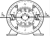 ЭДС самоиндукции в коммутируемых секциях возникает при прохождении этих секций вблизи геометрической нейтрали и зависит от значения тока нагрузки. Если в это время каким-нибудь дополнительным полем в коммутируемой секции создать равную и противоположную ЭДС, то дополнительный ток при этом может исчезнуть. Именно так и поступают на практике. Дополнительные полюсы размещают на геометрической нейтрали и снабжают обмотками, включенными последовательно в цепь нагрузки (Рис.6-9). Дополнительные полюсы своим полем индуцируют в коммутирующих секциях коммутирующую ЭДС, пропорциональную току нагрузки, и компенсирующую ЭДС самоиндукции в секции, при этом поле дополнительных