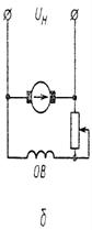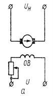имеет обмотку возбуждения ОВ, включаемую последовательно с якорем (Рис.6-10, в). При отсутствии нагрузки (
