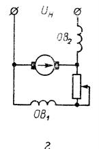 Генератор независимого возбуждения имеет обмотку возбуждения ОВ, подключаемую к постороннему источнику тока через регулировочный реостат (Рис.6-10, а). Напряжение на зажимах такого генератора (кривая I на Рис.6-11) с увеличением тока нагрузки несколько уменьшается в результате падения напряжения на внутреннем сопротивлении якоря, причем напряжения получаются всегда устойчивыми. Это свойство оказывается весьма ценным в электрохимии (питание электролитических ванн).