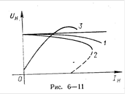 =0) в якоре все же возбуждается небольшая ЭДС за счет остаточной индукции в машине (кривая 3 на Рис.6-11). С ростом нагрузки напряжение на зажимах генератора сначала растет, а после достижения магнитного насыщения магнитной системы машины оно начинает быстро уменьшаться из-за падения напряжения на сопротивлении якоря и из-за размагничивающего действия реакции якоря.