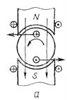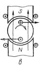 Если генератор включить в сеть постоянного тока, то в обмотках якоря и электромагнитов установится ток, при этом электромагниты создадут постоянное магнитное поле и на каждый проводник обмотки якоря с током начнет действовать сила, стремящаяся повернуть якорь в сторону действия силы (Рис.6-12, и). Таким образом, взаимодействие магнитного поля якоря с полем обмотки возбуждения приводит якорь во вращение.