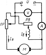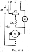 Схема включения двигателя постоянного, тока параллельного возбуждения через пусковой реостат ПР изображена на рисунке 6-13. Если обмотку возбуждения такого двигателя включить через регулировочный реостат РВ на напряжение другого источника, то получится двигатель независимого возбуждения.