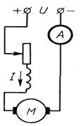 , полярность которой противоположна полярности напряжения сети. Эта ЭДС вызывает ослабление тока в якоре, а ее значение пропорционально скорости вращения якоря, т.е. по мере разгона двигателя ток будет уменьшаться и пусковой реостат можно выводить.