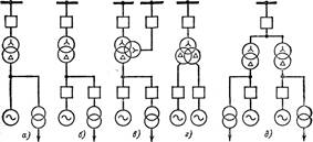 а, б, в — генератор — трансформатор с ответвлением на с. н.; г — блок с двумя генераторами; д — спаренные блоки.