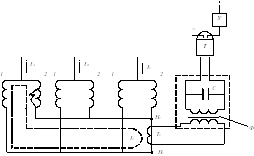 . Их вторичные обмотки соединяются последовательно, как показано на рисунке, разноимёнными полярностями. Дифференциальное реле