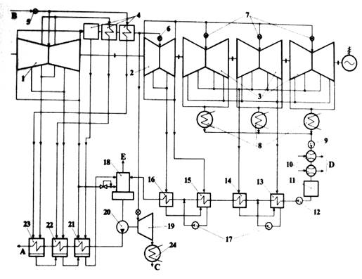 А - питательная вода к ПГ; В - острый пар из ПГ; С - слив конденсата из конденсатора ТППН в основной конденсатор; D - конденсат от эжекторов в основной конденсатор; Е - выпар деаэратора; 1 -ЦВД 2 - ЦСД; 3 - ЦНД; 4 -СПП; 5 - СРК; 6,7 - ОЗ; 8 - основной конденсатор; 9 - КН1; 10 - эжекторы; 11-БОУ; 12-КН2; 13-16 - ПНД; 17-ДНІ,2; 18 - деаэратор; 19-ТППН; 20 - ПН; 21-23 - ПВД; 24- конденсатор приводной турбины.