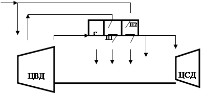 Проточная часть ЦНД и в значительной степени вся его конструкция унифицированы с ЦНД турбины К-500-60/1500. Каждый из потоков имеет пять ступеней. Последняя ступень имеет средний диаметр 4150 мм, длину рабочей лопатки 1450 мм. Корпус ЦНД выполнен одностенным ввиду сравнительно небольшого давления на входе (примерно 0,35 МПа).Принципиальная тепловая схема установки показана на рис.1.