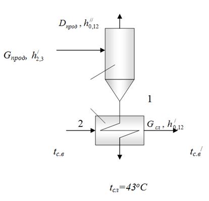 Продувочная вода поступает в расширитель (сепаратор) непрерывной продувки. Образующийся насыщенный пар давлением 0,12 МПа подается в коллектор пара или непосредственно в деаэратор. Горячая вода, выходящая из расширителя, пропускается через подогреватель сырой воды, который является первой ступенью подогрева сырой холодной водопроводной воды. Охлажденная до tсл=43оС продувочная вода сливается в канализацию или используется для технических целей.
