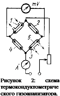 Принцип действия детектора основан на зависимости температуры нагреваемой током проволочки 1 (см. рис.1) от теплопроводности омывающей ее газовой смеси. Подобный детектор (датчик) часто называют катарометр.