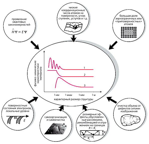 Наконец, если объект имеет атомарный масштаб в одном, двух или трех направлениях, его свойства могут резко отличаться от объемных для того же материала из-за проявления в поведении квантовых закономерностей. Например, когда хотя бы один из размеров объекта становится соизмеримым с длиной волны де Бройля для электронов, вдоль этого направления начинается размерное квантование.