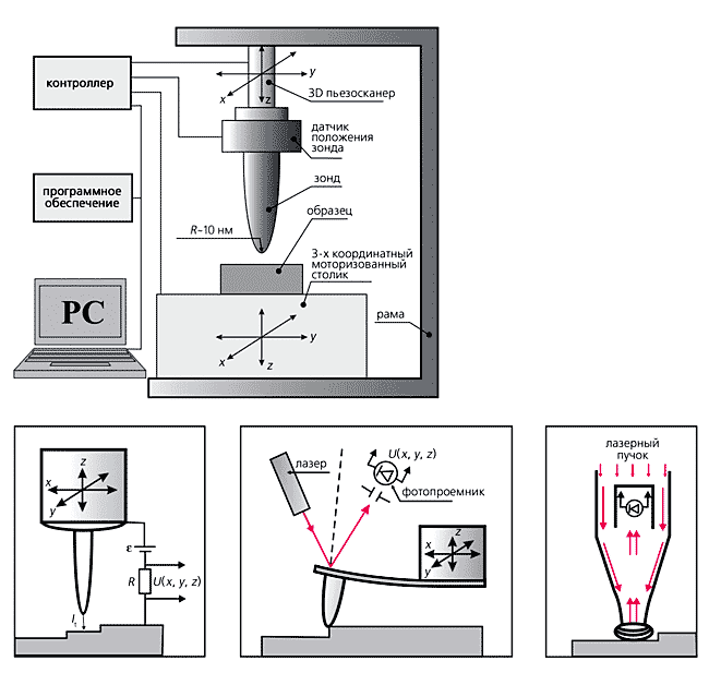 Как видно из названия, общее у этих методов - наличие зонда (чаще всего это хорошо заостренная игла с радиусом при вершине ~10 нм) и сканирующего механизма, способного перемещать его над поверхностью образца в трех измерениях. Грубое позиционирование осуществляют трехкоординатными моторизированными столами. Тонкое сканирование реализуют с помощью трехкоординатных пьезоактюаторов, позволяющих перемещать иглу или образец с точностью в доли ангстрема на десятки микрометров по х и y и на единицы микрометров - по z. Все известные в настоящее время методы SPM можно условно разбить на три основные группы:
