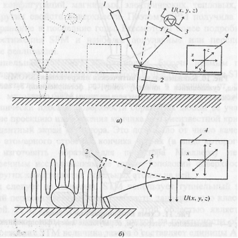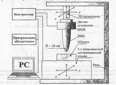 Ключевая идея зондовой микроскопии относительно проста. Как видно из названия (SPM) общим у этих методов является наличие зонда (чаше всего это хорошо заостренная игла с радиусом при вершине, равным 10 нм) и сканирующего механизма, способного перемещать его над поверхностью образца в трех измерениях (рис. 1).