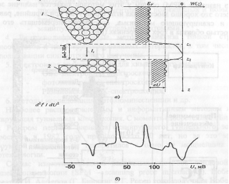 Рис. 2. Принцип действия сканирующего туннельного зондового микроскопа ( STM ) (а) и типичная зависимость туннельного спектра для кремниевого диода При Т=4,2К (б) : 1- зонд; 2- образец; It - туннельный ток в зазоре δ; ЕF - уровень Ферми; U - напряжение, приложенное к зазору (0,01-10 В); W - энергия; е - заряд электрона; Z - ось, перпендикулярная к поверхности образца