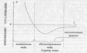 В 1995 году был предложен «неконтактный» режим, позволивший достичь истинно атомного разрешения и снизить нагрузку на кончик зонда и исследуемую поверхность. Этот метод реализуется путем измерения параметров собственных колебаний кантилевера (резонансной частоты, затухания, сдвига фазы между приложенной возбуждающей силой и смещением), игла которого находится достаточно далеко от поверхности (десятки или сотни ангстрем) и взаимодействует с ней посредством дальнодействующих сил Ван дер Ваальса (см. рис. 3). Промежуточный режим «квазиконтакта» (tappingmode в англоязычной литературе), а также регистрация латеральных сил (FrictionForceMicroscopy - FFM) еще более повышают пространственное разрешение.