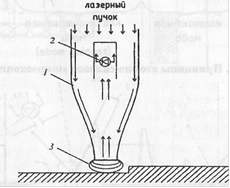 1 - волновод, сужающийся к нижнему концу; 2- фотоприемник; 3- световое поле открытого конца волновода с диаметром меньше длины волны света