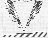 1 - острие; 2-4- напыленные гетерослои, образующие лазер, фотоприемник, термопару и т.д.