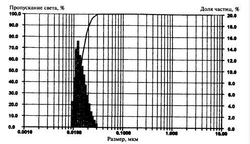 Рис. 11. Измерения распределения размеров частиц проводящего полимера, диспергированного в органической жидкости, при освещении лазерным лучом. Размеры лежат в диапазоне от 9 до 30 нм с максимумом при 12 нм.