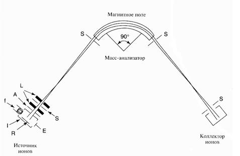 Показаны детали источника ионов: А – ускоряющая пластина или экстрактор, Е – электронная ловушка, f – нить накаливания, I – ионизационная камера, L – фокусирующие линзы, R – отражатель частиц, S – щели. Магнитное поле в масс-анализатое перпендикулярно плоскости рисунка.