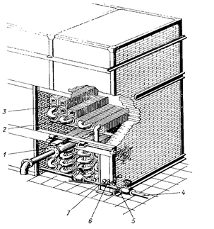 На рис 3 показана компоновка стального водяного экономайзера. Питательная вода поступает в нижний коллектор, и, пройдя по параллельно включённым змеевикам, направляется в промежуточный коллектор экономайзера для выравнивания распределения воды по отдельным змеевикам. Установка промежуточных коллекторов особенно необходима, если в экономайзере происходит частичное парообразование, так как перемешивание должно производиться до начала парообразования. При этом недогрев воды на входе в кипящую часть поверхности нагрева экономайзера должен составлять не менее 40 К.