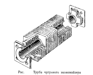 Чугунный водяной экономайзер состоит из ребристых чугунных труб. Труба выпускаемых в настоящее время экономайзеров конструкции ВТИ показана на рис 2. Трубы соединяются между собой посредством калачей, как показано на рис 1. Питательная вода последовательно проходит по всем трубам снизу вверх, что обеспечивает удаление воздуха из экономайзера. Продукты сгорания проходят через зазоры между рёбрами труб.