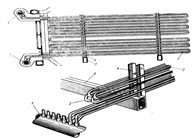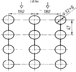 Для предохранения змеевиков от износа на прямых участках и закруглениях труб устанавливают защитные манжеты. Иногда устанавливают групповую защиту закруглений труб, например у разделительных перегородок. Для защиты прямых участков труб от интенсивного износа к ним приваривают прутки под углом 40—50° к направлению газового потока или уголок.