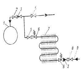 1-барабан парогенератора; 2-запорный вентиль; 3-обратный клапан; 4-вентиль на сгонной линии для подачи воды в деаэратор; 5-вентиль после водяного экономайзера; 6-предохранительный клапан; 7-чугунный водяной экономайзер; 8-вентиль перед водяным экономайзером; 9-линия подачи воды от питательного насоса.