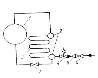 1-барабан парогенератора; 2-коллекторы водяного экономайзера; 3-водяной экономайзер; 4-предохранительный клапан; 5-обратный клапан; 6-запорный вентиль; 7-вентиль на линии рециркуляции.