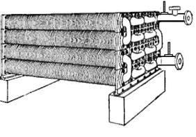 Чугунные экономайзеры собирают из чугунных ребристых труб с фланцами и соединяют между собой с помощью чугунных колен (калачей) таким образом, чтобы питательная вода могла последовательно пройти по трубам от нижних коллекторов к верхним.