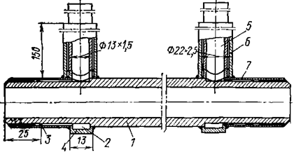 1 – труба; 2 – канавка; 3 – спай; 4 – защитное кольцо; 5 – отводная трубка; 6 – кожух; 7 – металлический стержень;