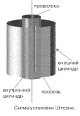 Для постановки опыта по измерению средней скорости движения молекул О. Штерн спроектировал специальную установку. Прибор состоял из двух жестко соединенных коаксиальных цилиндров с радиусами R и r (рис. 1-3). Во внутреннем цилиндре по оси была расположена платиновая нить А. Исследуемым газом в опыте служили разреженные пары серебра. Атомы получались при испарении слоя серебра, нанесённого на платиновую нить, нагревавшуюся электрическим током. Воздух в малом цилиндре был откачан, поэтому испарившиеся атомы серебра свободно разлетались от нити во все стороны.