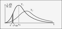 Вид распределения dn/ndv, описываемого выражением (2.11), для двух различных температур (T2 > T1) представлен на рис. 9.