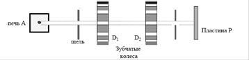 Элдридж (1927 г.) и Ламмерт (1926-1929) ввели селекторы скоростей, работающие на принципе зубчатого колеса (как в опытах Физо со светом). Идея опыта схематически изображена на рис.6. Пучок молекул из печи А коллимировался на щелях и попадал на вращающиеся зубчатые диски D1 и D2.