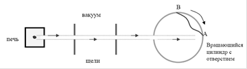 Цартман попытался избежать этого эффекта и усовершенствовал опыты (рис. 7). Из печи коллимированный пучок атомов попадал на вращающийся цилиндр с отверстием. При попадании пучка в отверстие молекулы осаждались на внутренней стенке цилиндра. При этом у точки А собирались атомы или молекулы с очень большими скоростями, а к точке В – более медленные молекулы.