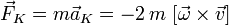 где m — точечная масса, ω — вектор угловой скорости вращающейся системы отсчёта, ύ — вектор скорости движения точечной массы в этой системе отсчёта, квадратными скобками обозначена операция векторного произведения.