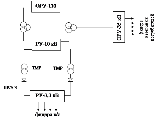 На этих тяговых подстанциях осуществляется двухступенчатая трансформация, т.е. от РУ питающего напряжения (ОРУ-110 кВ) электроэнергия поступает вначале на понижающие трансформаторы, которые понижают напряжение до 35 кВ и до 10 кВ. От ОРУ-35 кВ питаются нетяговые потребители, т.е. районные потребители, находящиеся в зоне электрифицируемой линии (в пределах до 30 км в сторону от нее). От РУ-10 кВ электроэнергия поступает на тяговые трансформаторы, понижающие напряжение до 3,02 кВ. С помощью полупроводниковых выпрямителей ПВЭ-3 напряжение выпрямляется и подается в контактную сеть. (рис.3).
