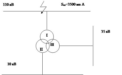Понижающие трансформаторы – трехобмоточные, предназначены для питания тяговой и районной нагрузки. Они имеют одну первичную, и две вторичные обмотки. Одна вторичная обмотка, соединенная в звезду – обмотка среднего напряжения (СН) – питает ОРУ-35 кВ, предназнаяенное для питания районной нагрузки. Другая вторичная обмотка, соединенная в треугольник – обмотка низкого напряжения (НН) – питает РУ-10 кВ, предназначенное для питания тяговых и не тяговых потребителей.