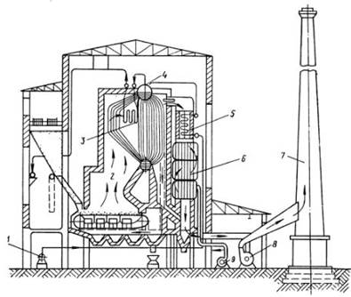 Дымовые газы из топки поступают в газоходы котла, образуемые обмуровкой и специальными перегородками, установленными в пучках труб. При движении газы омывают пучки труб котла и пароперегревателя 3, проходят через экономайзер 5 и воздухоподогреватель 6, где они также охлаждаются вследствие передачи тепла воде, поступающей в котел, и воздуху, подаваемому в топку. Затем значительно охлажденные дымовые газы при помощи дымососа 5 удаляются через дымовую трубу 7 в атмосферу. Дымовые газы от котла могут отводиться и без дымососа под действием естественной тяги, создаваемой дымовой трубой.