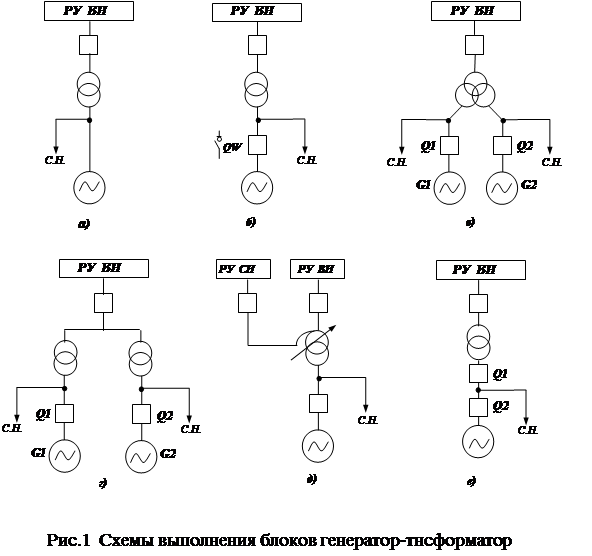 Различают следующие схемы исполнения блоков (АЭС): генератор - трансформатор (рис.1.а), генератор-трансформатор с генераторным выключателем или выключателем нагрузки (рис.1,б), укрупненный блок (рис.1,в), объединенный блок (рис.1,г), блок генератор-автотрансформатор связи (рис.1,д), блок генератор-трансформатор с двумя выключателями (рис.1,е) и др.