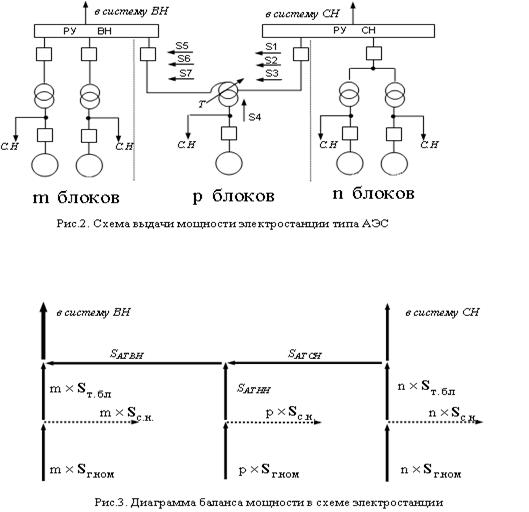 Выбор мощности блочных трансформаторов и автотрансформаторов связи в каждом варианте схемы выдачи мощности выполняется по максимальным перетокам мощности с учетом их нагрузочной способности. На рис.2. приведена принципиальная схема выдачи мощности АЭС с произвольным числом блоков и двумя РУ повышенного напряжения. Для нахождения перетоков мощности в схеме составляется диаграмма баланса мощности (рис.3).