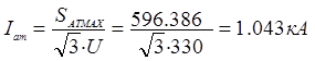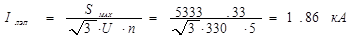 где Sном – мощность самого мощного присоединения (для ОРУ ВН и ОРУ СН) с одним выключателем наприсоединение, или мощность, передаваемая по линии, где установлен выключатель (для остальных участков).б) Iраб. max - суммарный ток двух присоединений для ОРУ по схеме 3/2 или суммарный ток трех присоединений наиболее нагруженной цепи ОРУ, собранного по схеме 4/3.